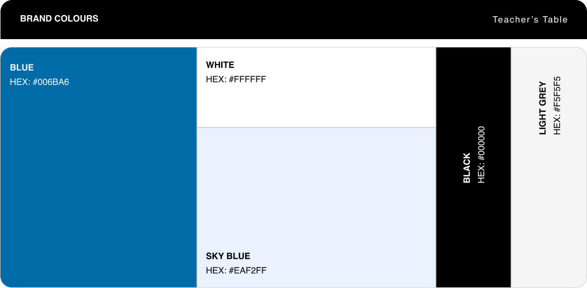 The Teacher’s Table design system uses a calming palette of blues, soft greys, and whites to create a trustworthy and welcoming learning environment. The bold primary blue (#006BA6) anchors the brand with clarity and confidence, while sky blue and light grey bring visual softness to the interface. Paired with clean, geometric typography, the system ensures high legibility across devices — supporting a user experience that feels structured, accessible, and education-focused.